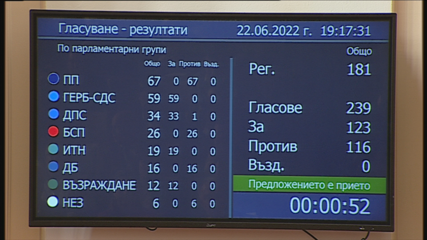 Правителството на Кирил Петков не оцеля след вота на недоверие, внесен от опозицията. 123 депутати гласуваха "за" вота срещу 115 депутати "против", предаде БНТ.