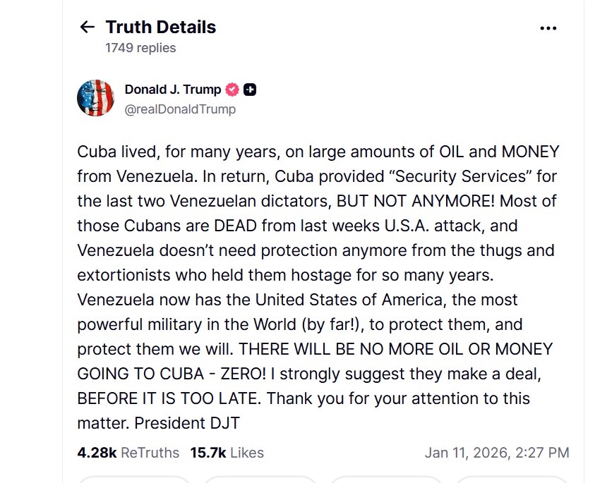„Куба в продължение на много години живееше за сметка на големи обеми нефт и пари от Венецуела… Нито нефт, нито пари повече няма да постъпват в Куба – нула! Горещо им препоръчвам да сключат сделка, преди да стане твърде късно“, написа Тръмп в своята социална мрежа Truth Social.