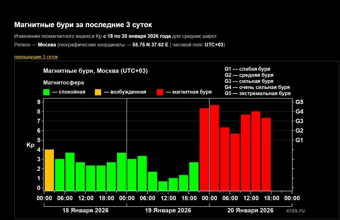 Руската лаборатория за изследване на слънчевата активност към РАН публикува на сайта си следната графика, според която през днешния ден индексът Кр е достигал до над 8,5 бала: