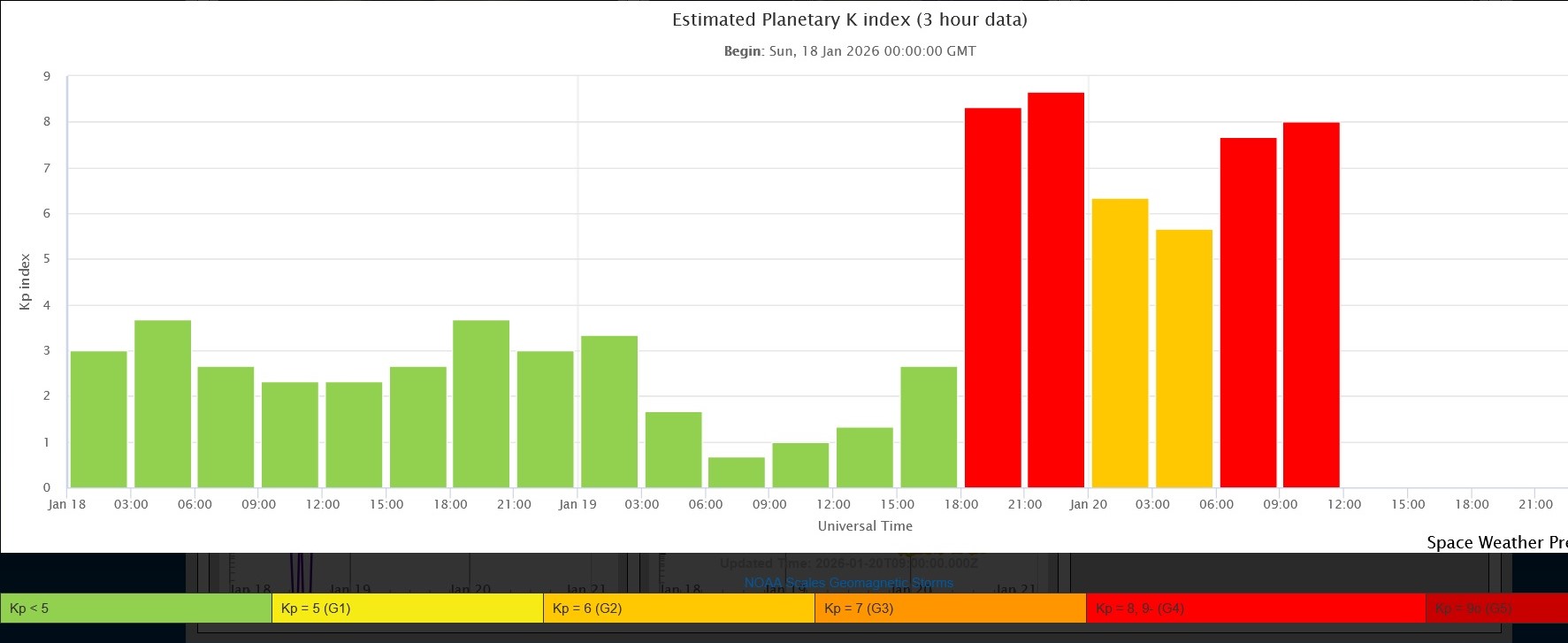 Според Националния институт по геофизика, геодезия и география към БАН, в момента планетарният Kp индекс (мярка за смутеността на земното магнитно поле) е 6 единици.
