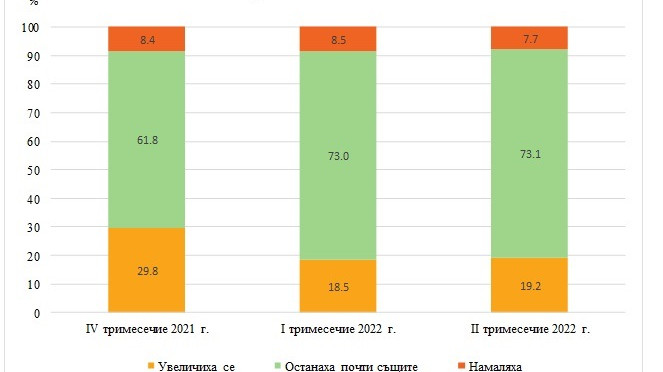 През второто тримесечие на 2022 г., за 73% от лицата доходът на домакинството им е останал без промяна спрямо последните 12 месеца. Увеличение на доходите са посочили 19,2% от лицата, което е с 0,7 процентни пункта повече в сравнение с първото тримесечие на 2022 г., но с 10,6 процентни пункта по-малко в сравнение с четвъртото тримесечие на 2021 г., когато увеличение са имали 29,8% от лицата.